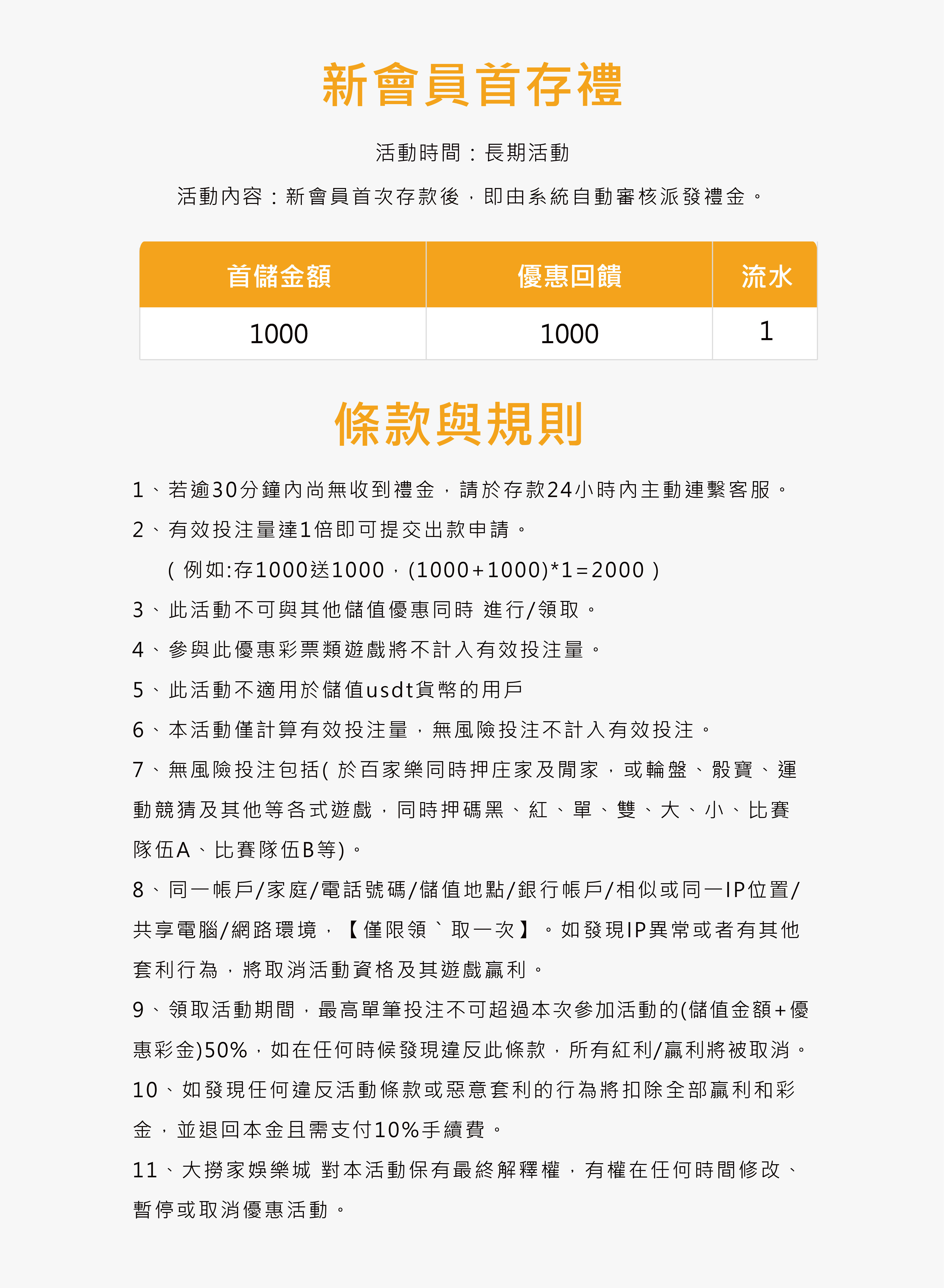 相關規範如有任何異動,大撈家娛樂城有權在任何時間修改、暫停或取消,無須通知並保留本活動最終解釋權。
